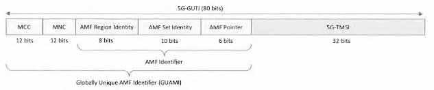 The structure of the 5G-GUTI is illustrated in the below figure. It is a concatenation of the Globally Unique AMF Identifier (GUAMI) and 5G-TMSI. The GUAMI is a concatenation of the PLMN Identity and the AMF Identifier. Inclusion of the GUAMI allows identification of the AMF which allocated the 5G-GUTI. The 5G-TMSI identifies the UE within that AMF.